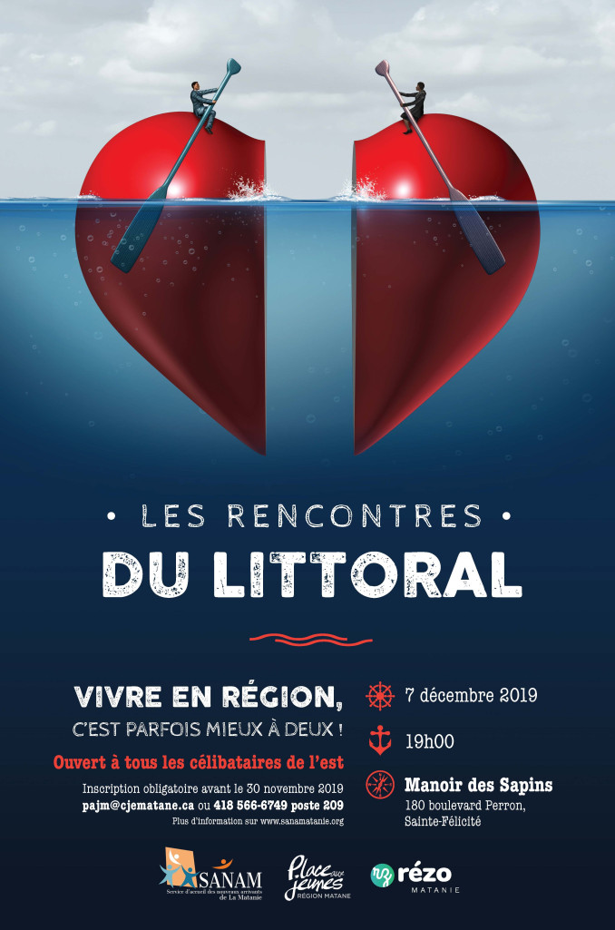 Pour une 4e édition, le Service d'accueil des nouveaux arrivants de La Matanie – SANAM et Place aux jeunes – Matane organisent une soirée de réseautage pour célibataires Les rencontres du littoral. Cette édition aura lieu le 7 décembre prochain à 19h, à l'Auberge de Jeunesse du Manoir des Sapins à Sainte-Félicité.